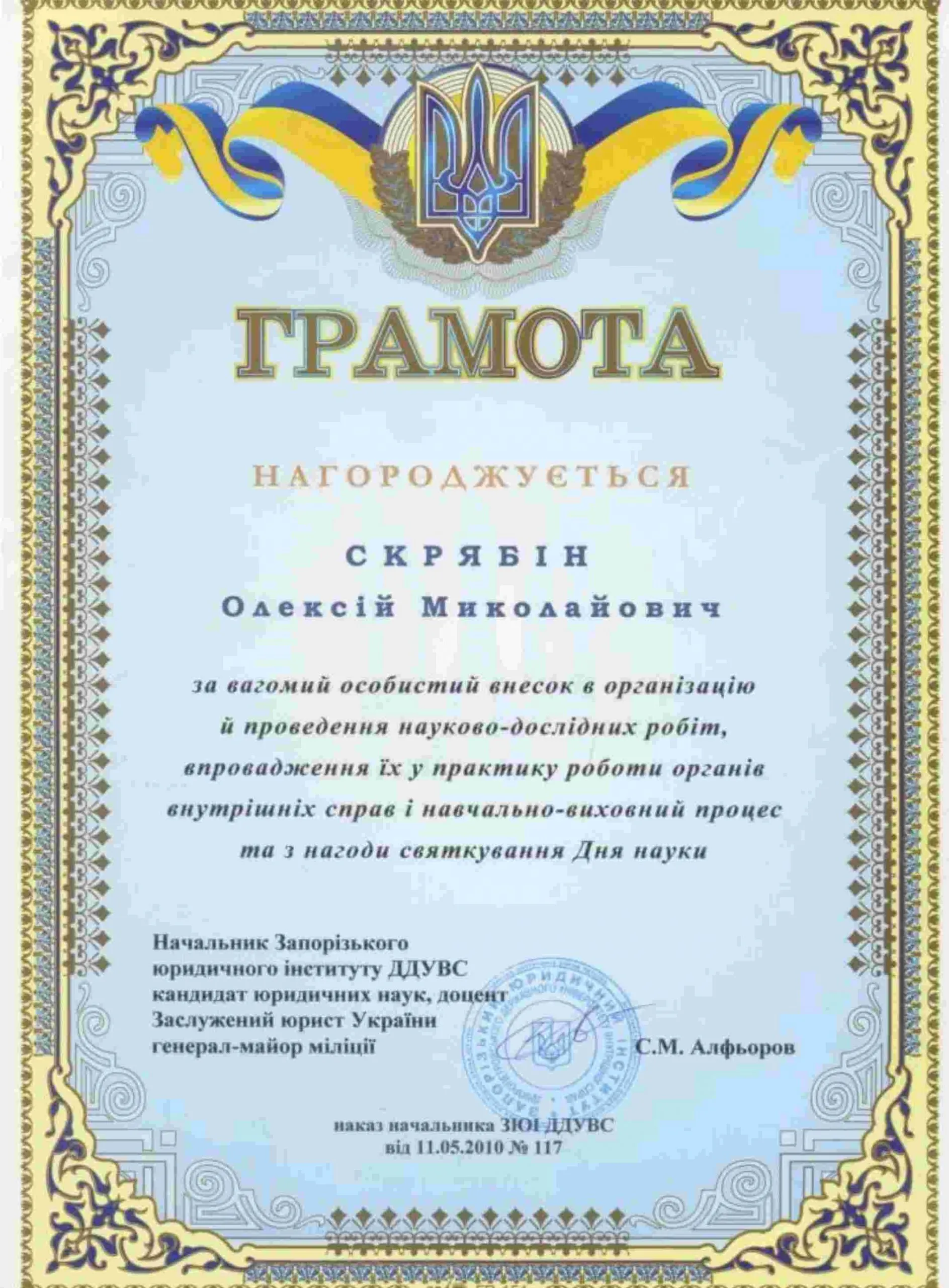 Посвідчення адвоката України Олексія Скрябіна Свідоцтво про право на заняття адвокатською діяльністю Олексія Скрябіна, видане на підставі рішення Запорізької обласної КДКА Свідоцтво про підвищення кваліфікації Олексія Скрябіна Сертифікат учасника науково-практичної конференції «Законодавство України: недоліки, проблеми систематизації та перспективи розвитку» Сертифікат на підтвердження участі Олексія Скрябіна в програмі Open World 2012 Сертифікат на підтвердження участі Олексія Скрябіна у міжнародній науково-практичній конференції Посвідчення Олексія Скрябіна як члена Запорізької обласної організації Асоціації українських правників Диплом бакалавра права, здобутий Олексієм Скрябіним у 2004 році Диплом з відзнакою про здобуття магістерської освіти, отриманий Олексієм Скрябіним у 2017 році за спеціальністю “Управління навчальним закладом” Диплом про перепідготовку, здобутий Олексієм Скрябіним у 2006 році за спеціальністю “Муніципальне управління” Диплом магістра Олексія Скрябіна, здобутий у 2017 році за спеціальністю “Державна служба” Диплом з відзнакою Олексія Скрябіна, здобутий у 2005 році за спеціальністю “Правознавство” Диплом Олексія Скрябіна, здобутий у 2007 році в “Запорізькому інституті державного та муніципального управління” за спеціальністю “Психологія” Диплом магістра міжнародного права Олексія Скрябіна, отриманий у 2019 році в “Класичному приватному університеті” Диплом магістра філології Олексія Скрябіна, отриманий у 2020 році Диплом кандидата юридичних наук Олексія Скрябіна, присуджений за спеціальністю “Юридична психологія” Диплом доктора юридичних наук Олексія Скрябіна, присуджений за спеціальністю “Кримінальний процес та криміналістика” Свідоцтво №639 на заняття адвокатською діяльністю, видане відповідно до Закону України “Про адвокатуру” Диплом за участь у міському конкурсі “Правозахисник року – 2010” у номінації за розробку законодавчих норм і новацій Сертифікат за участь у семінарі-тренінгу “Відновне правосуддя в практиці адвокатів” Довідка про те, що Олексій Скрябін не перебуває у розшуку та не має судимості на території України Додаток до диплому кандидата наук, що підтверджує спеціальність у галузі юридичної психології та освіту Сертифікат на підтвердження участі Олексія Скрябіна в семінарі з актуальних питань застосування українського законодавства та міжнародних норм права Сертифікат на підтвердження участі Олексія Скрябіна в тренінгу щодо “Європейської конвенції в практиці адвокатів” Сертифікат на підтвердження участі Олексія Скрябіна в семінарі, присвяченому Кримінальному процесуальному кодексу України Подяка Олексію Скрябіну за внесок у навчання та виховання курсантів, покращення матеріально-технічної бази інституту на святкування Дня міліції Сертифікат Скрябіну Олексію Миколайовичу за підвищення кваліфікації адвокатів Лист подяки для Олексія Скрябіна за керівництво конкурсною роботою з юридичної психології Грамота нагородження Олексія Скрябіна за досягнення в професійній діяльності та відзначення Дня юриста. Сертифікат про успішне проходження курсу навчання у школі медичного права на тему “Правовий статус суб’єктів медичних правовідносин” Сертифікат Скрябіну О.М. за участь у міжнародній науковій конференції Подяка Скрябіну О.М. за керів